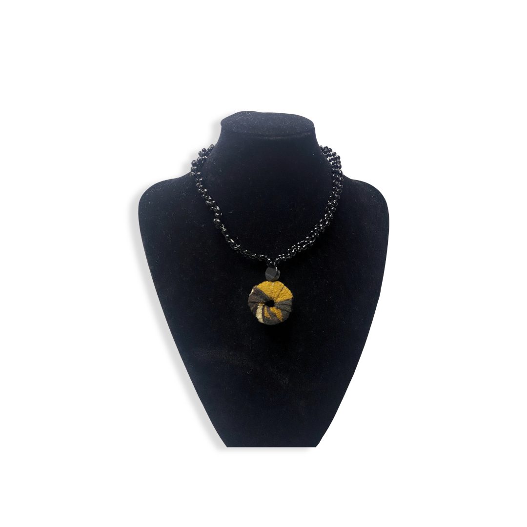 Collier en petite perle noires avec un pendentif en pagne bogolan.