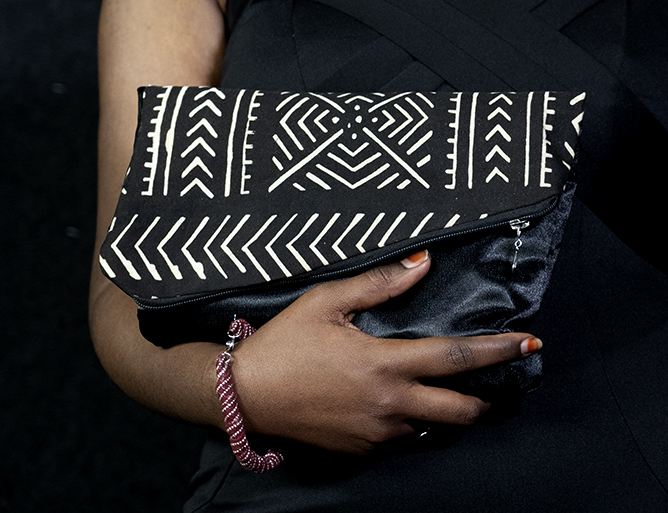 Faites sensation en optant pour l’authenticité et la beauté intemporelle de notre pochette en Bogolan et satin noir.